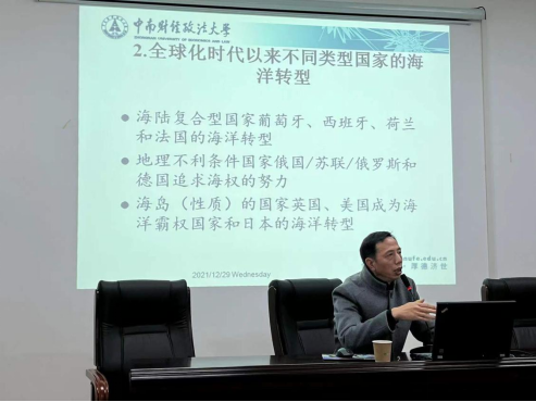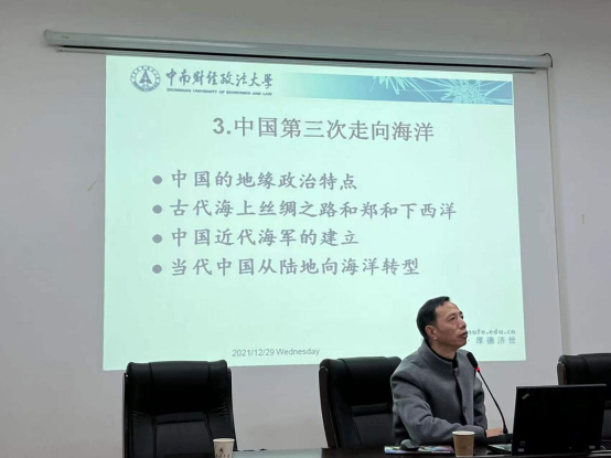 12月29日,公共管理學院邀請中南財經(jīng)政法大學政治學系主任劉新華教授,為學院師生進行了題為“當代中國從陸地大國向海洋大國轉(zhuǎn)型”的學術(shù)講座。本次講座由政治學系謝丹主任主持,學院部分專業(yè)教師和國際事務(wù)與國際關(guān)系專業(yè)的同學參加了本次講座。
