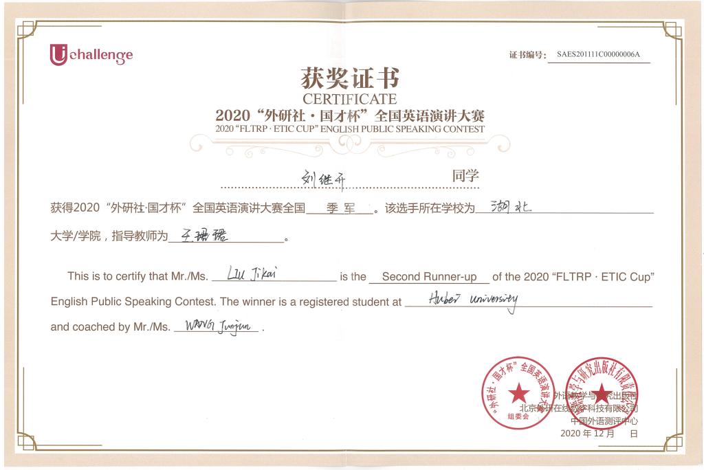 12月20日,2020“外研社?國(guó)才杯”大學(xué)生英語(yǔ)挑戰(zhàn)賽決賽在北京圓滿落幕。我院國(guó)際事務(wù)與國(guó)際關(guān)系(中外合作辦學(xué))專業(yè)2018級(jí)學(xué)生劉繼開(kāi)憑借過(guò)硬的綜合實(shí)力,從全國(guó)15萬(wàn)演講參賽者中披荊斬棘,脫穎而出,最終榮獲本屆挑戰(zhàn)賽全國(guó)英語(yǔ)演講大賽總決賽季軍。作為本年度比賽唯一晉級(jí)全國(guó)前24強(qiáng)的湖北選手,劉繼開(kāi)同學(xué)也創(chuàng)造了我校在全國(guó)英語(yǔ)演講賽事上的歷史最好成績(jī)。