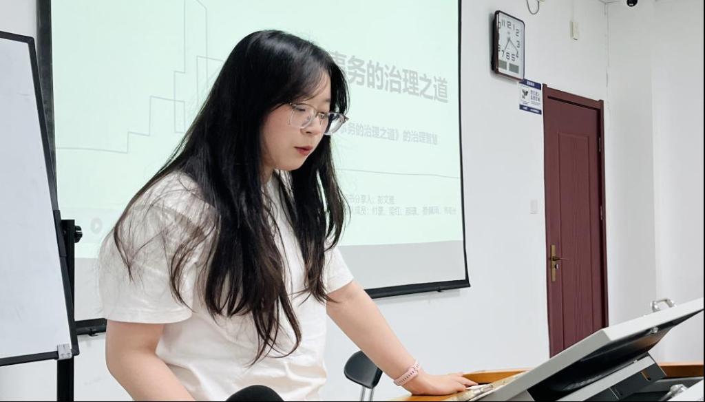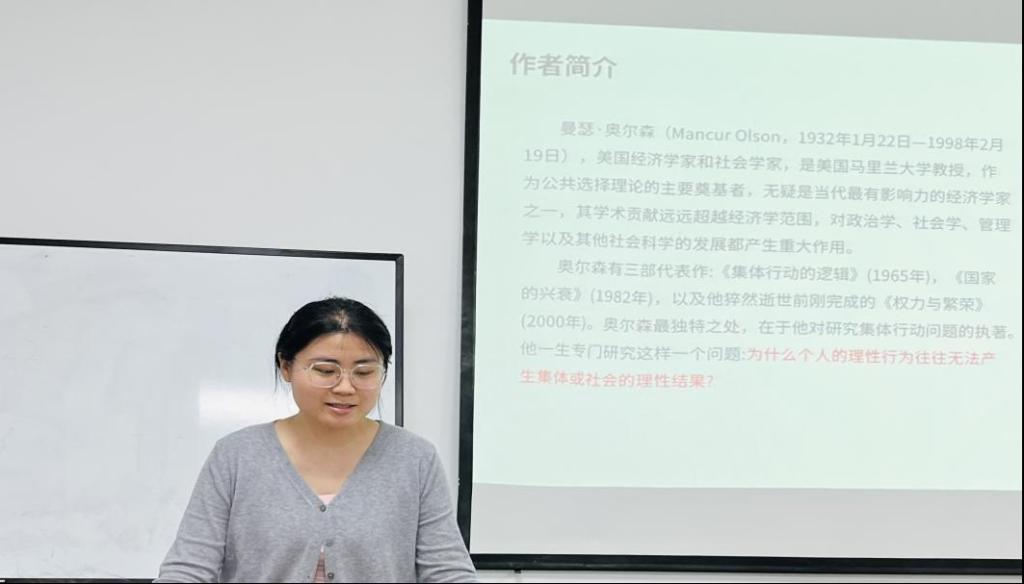 楊瑩瑩同學(xué)首先代表小組分享了曼瑟·奧爾森《集體行動的困境》的核心觀點,通過“三個和尚沒水喝”的生動比喻,闡釋了理性人假設(shè)下“搭便車”行為如何導(dǎo)致集體行動失敗。小組成員結(jié)合“河長制”“社區(qū)門前三包”等案例,剖析了選擇性激勵、規(guī)模效應(yīng)與制度約束在破解治理難題中的作用,提出“數(shù)字技術(shù)賦能監(jiān)督”“情感治理激活內(nèi)生動力”等創(chuàng)新思路。