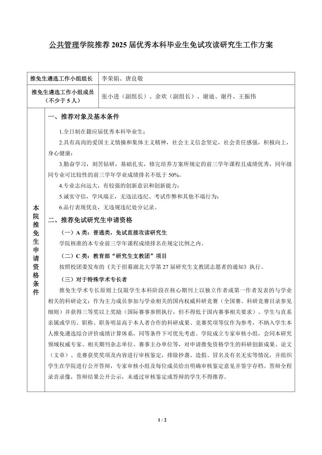 公共管理學(xué)院關(guān)于推薦2025屆優(yōu)秀本科畢業(yè)生免試攻讀研究生的通知 作者:教學(xué)辦發(fā)布時(shí)間:2024年09月10日 附件【附件1 湖北大學(xué)優(yōu)秀應(yīng)屆本科畢業(yè)生推薦免試攻讀研究生報(bào)名申請表.doc】已下載次 附件【附件2 湖北大學(xué)學(xué)生申請推薦免試攻讀研究生承諾書.doc】已下載次 附件【公共管理學(xué)院推薦2025屆優(yōu)秀本科畢業(yè)生免試攻讀研究生工作方案及工作完成時(shí)間節(jié)點(diǎn)表(定稿).pdf】已下載次 附件【公共管理學(xué)院推薦2025屆優(yōu)秀本科畢業(yè)生免試攻讀研究生綜合素質(zhì)成績評議細(xì)則(定稿).pdf】已下載次