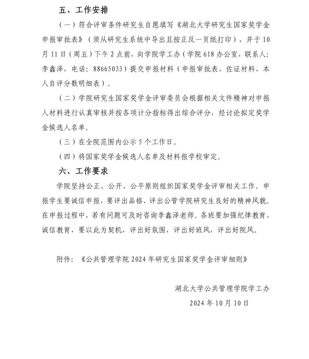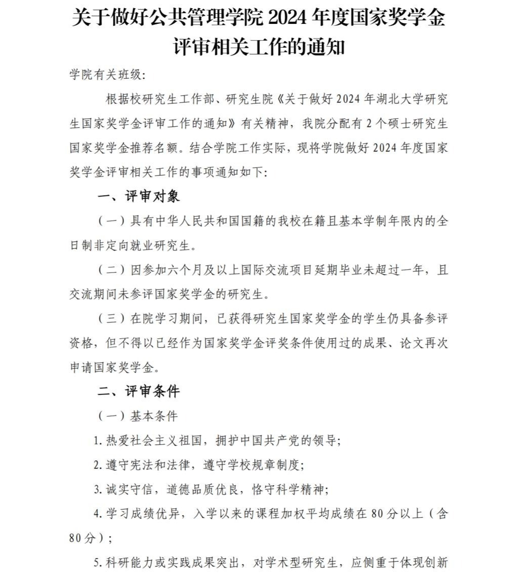 關(guān)于做好公共管理學(xué)院2024年度國(guó)家獎(jiǎng)學(xué)金評(píng)審相關(guān)工作的通知 作者:學(xué)工辦發(fā)布時(shí)間:2024年10月10日 附件【關(guān)于做好公共管理學(xué)院2024年度國(guó)家獎(jiǎng)學(xué)金評(píng)審相關(guān)工作的通知.pdf】已下載次 附件【附件1:公共管理學(xué)院2024年研究生國(guó)家獎(jiǎng)學(xué)金評(píng)審細(xì)則.pdf】已下載次 附件【附件2:湖北大學(xué)公共管理學(xué)院研究生國(guó)家獎(jiǎng)學(xué)金評(píng)定本人自評(píng)分?jǐn)?shù)明細(xì)表.docx】已下載次