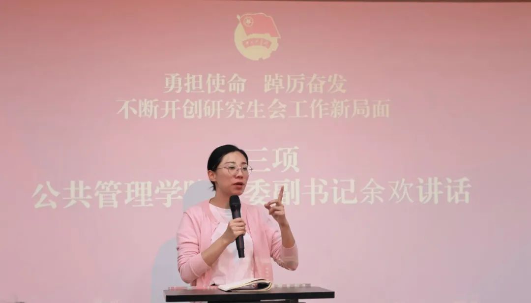 學(xué)院黨委副書記余歡發(fā)表了總結(jié)講話。表達(dá)了對(duì)新一屆研會(huì)同學(xué)們的歡迎以及對(duì)上一屆同學(xué)們工作的肯定。余歡指出研究生會(huì)既是聯(lián)系學(xué)院和研究生的橋梁,也是培養(yǎng)大家管理服務(wù)能力、團(tuán)隊(duì)協(xié)作能力、交流溝通能力和創(chuàng)新思維能力的重要平臺(tái)。余歡寄語新一屆研會(huì)成員要不忘初心,牢記宗旨;發(fā)揮作用,促進(jìn)交流;加強(qiáng)協(xié)作,打造隊(duì)伍。希望全體研會(huì)成員珍惜鍛煉機(jī)會(huì),秉承公管學(xué)院“永爭(zhēng)第一”的傳統(tǒng),再接再厲,再創(chuàng)佳績(jī)!